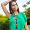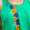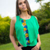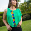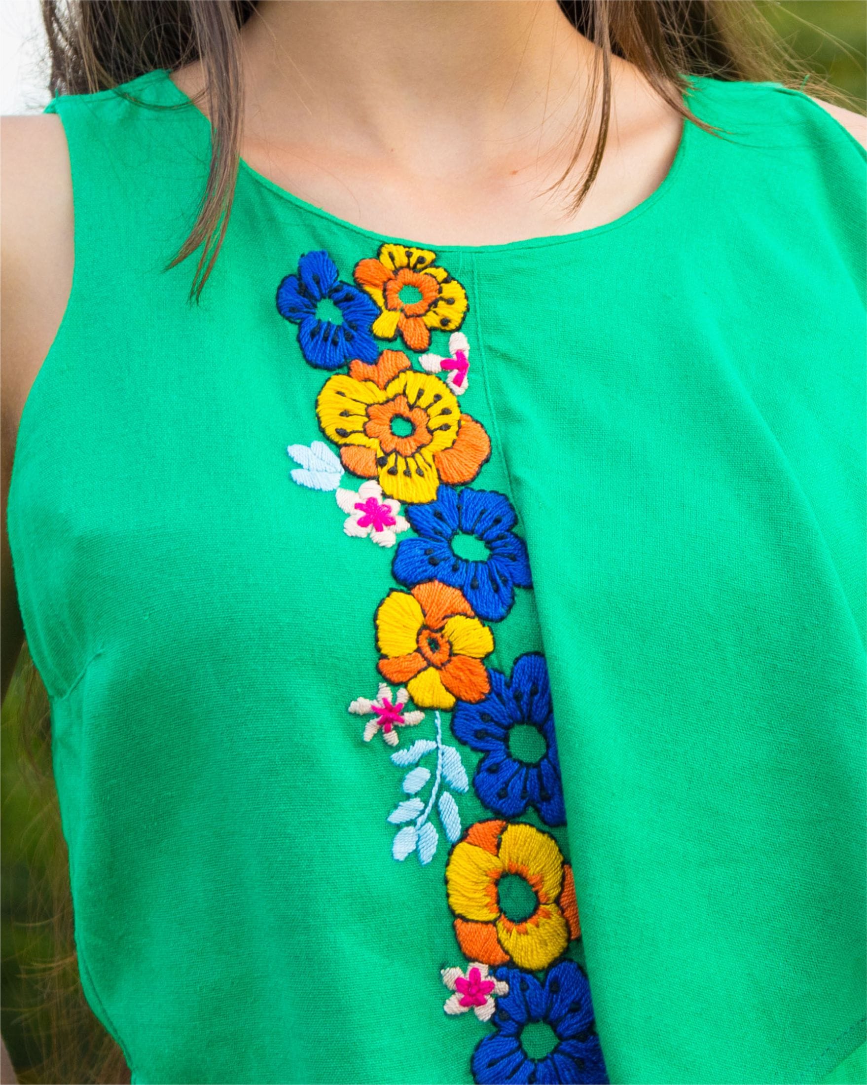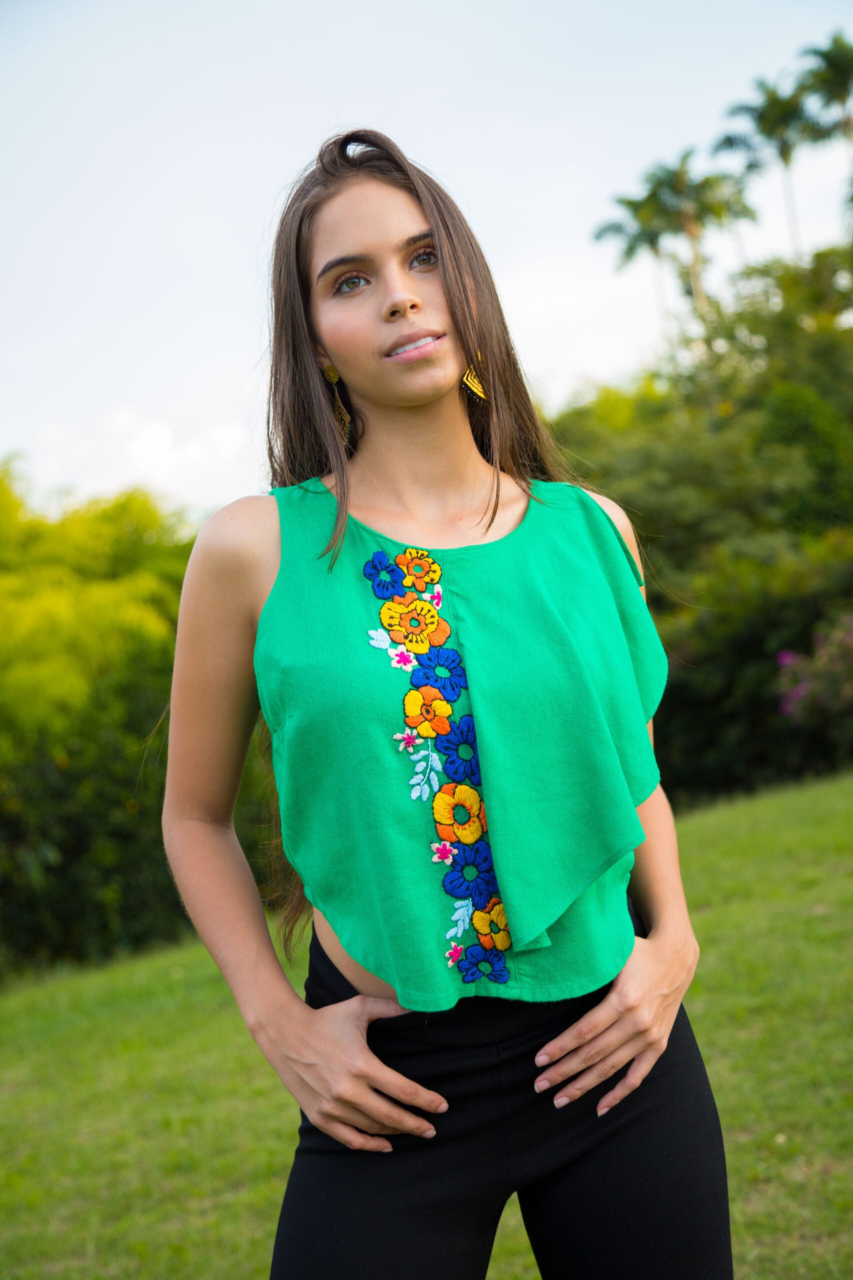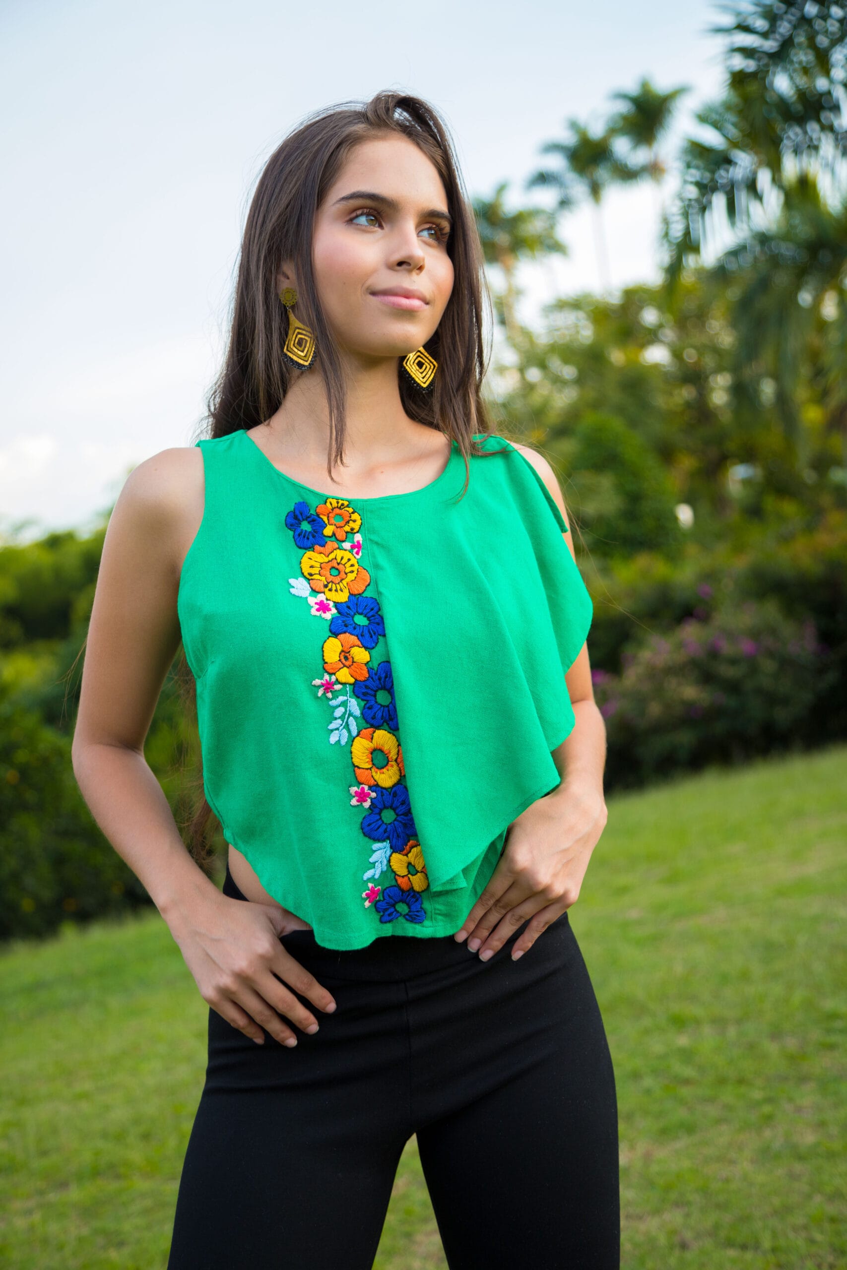 Blusa cuello redondo, sin mangas y a la cintura. Tiene un llamativo y hermoso bordado en todo el centro de la blusa lo que la hace elegante y juvenil. Producto bordado a mano.