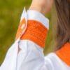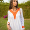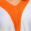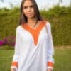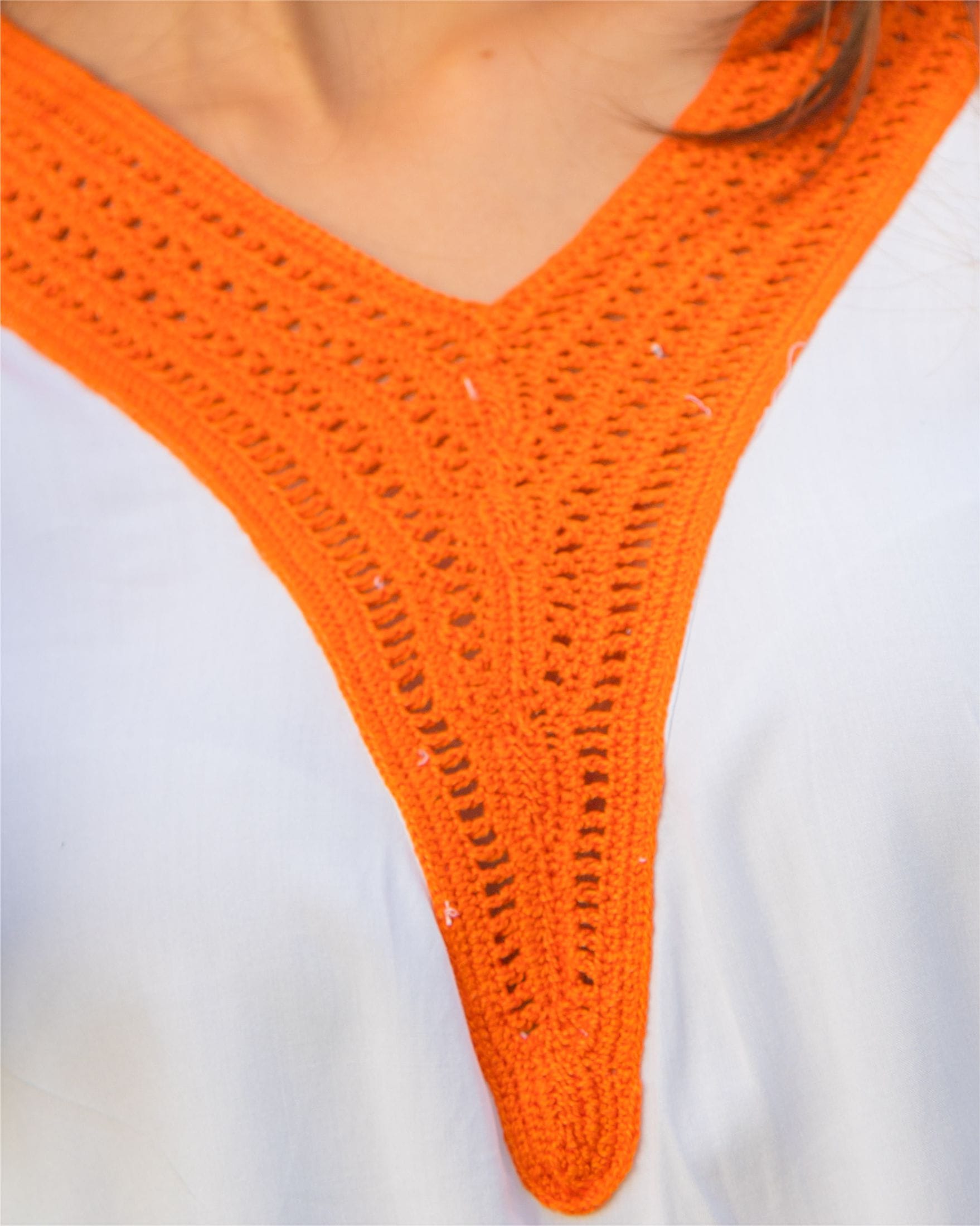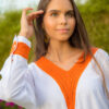«Un diseño que combina la pureza del blanco con la energía del naranja en sus bordados.»