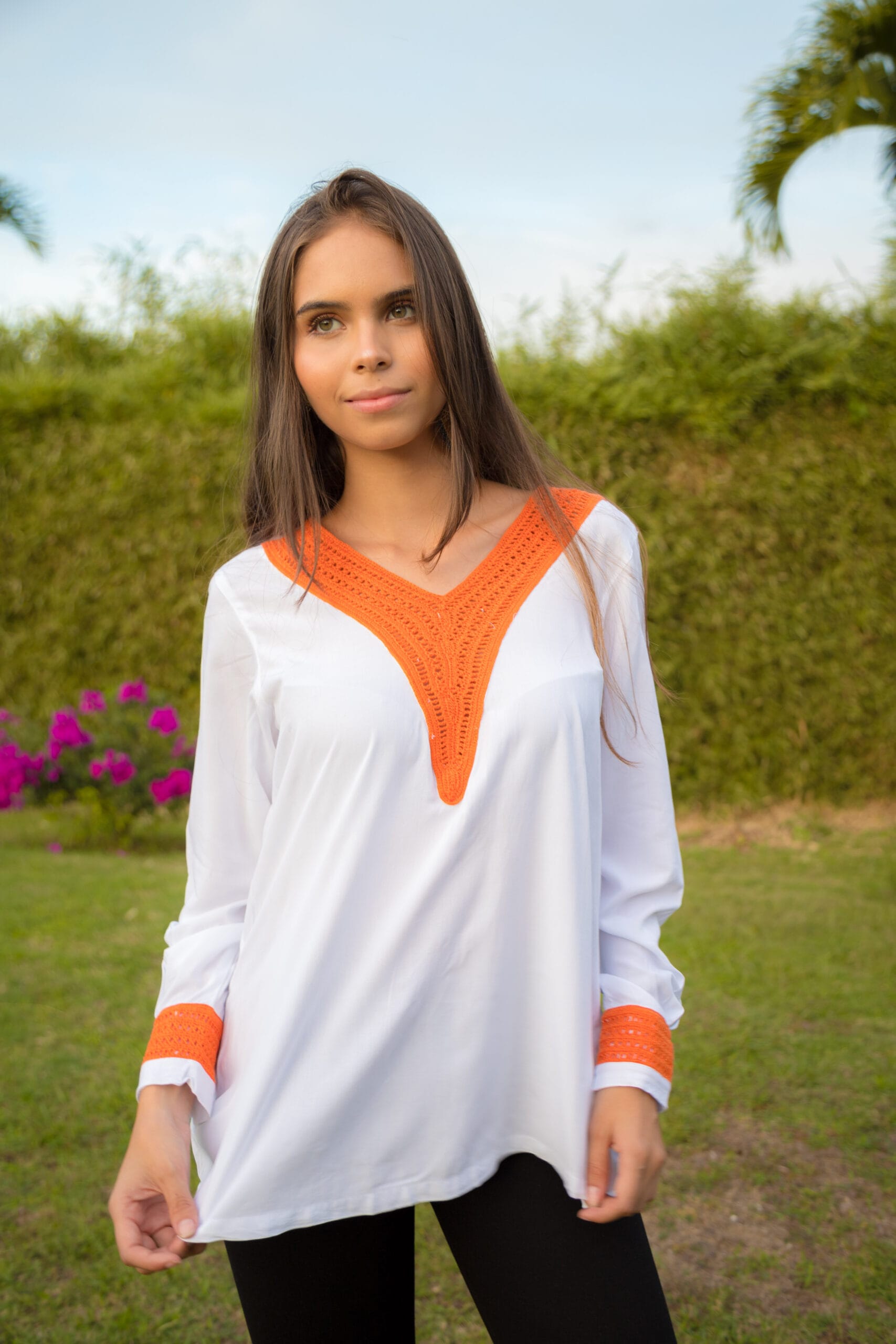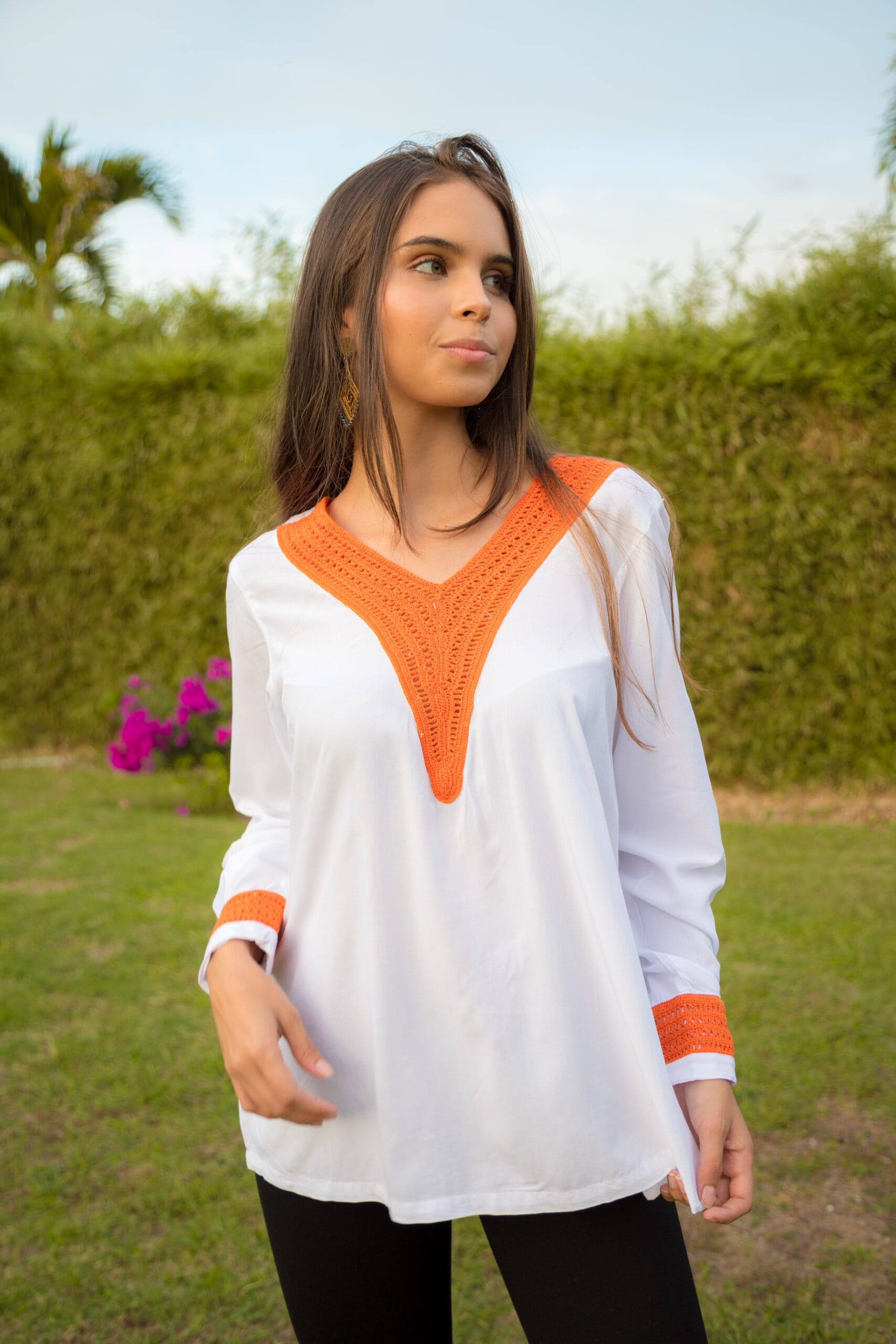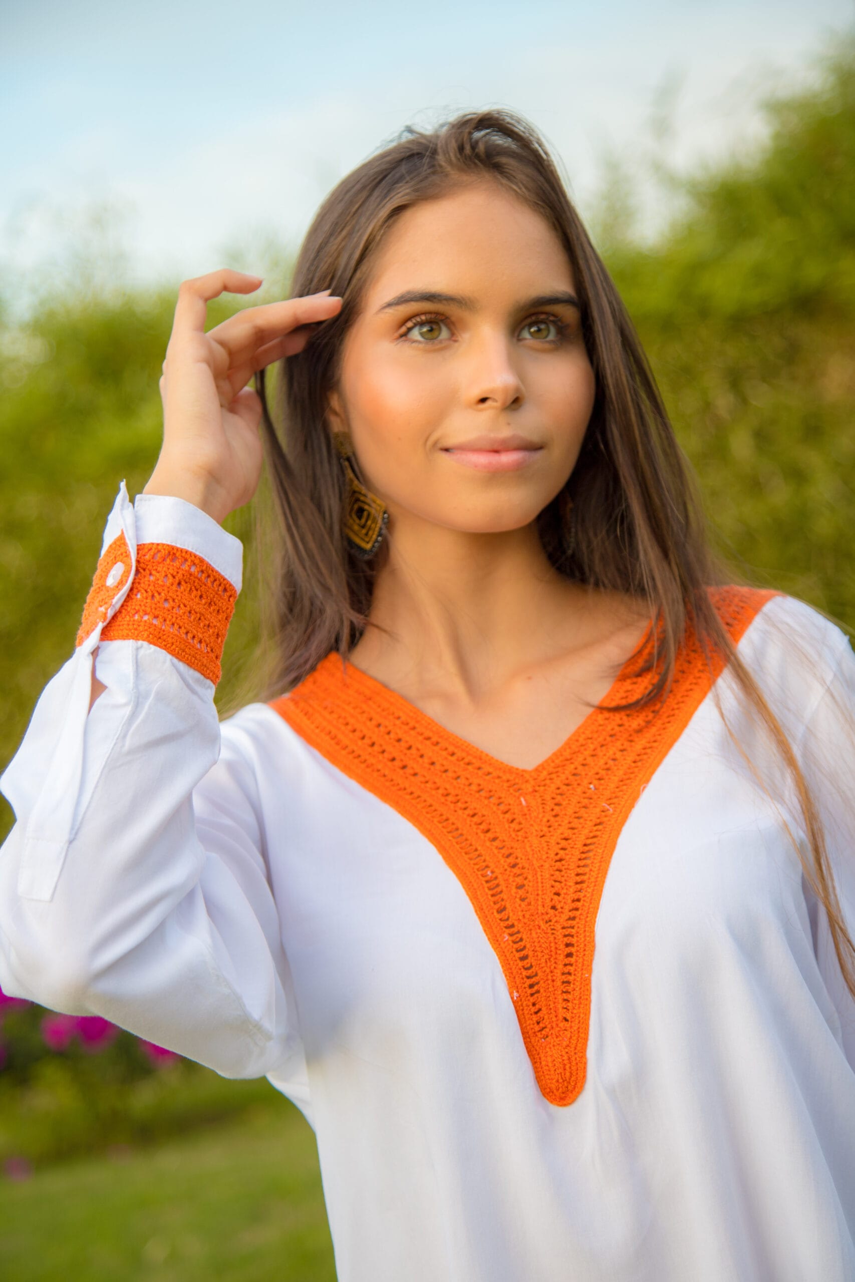«Descubre la moda que te hace brillar: blusa blanca con detalles bordados naranja, en puntadas Rococó y Pasado, una verdadera obra de arte», sintiendo la magia del bordado a mano resaltando tu feminidad.