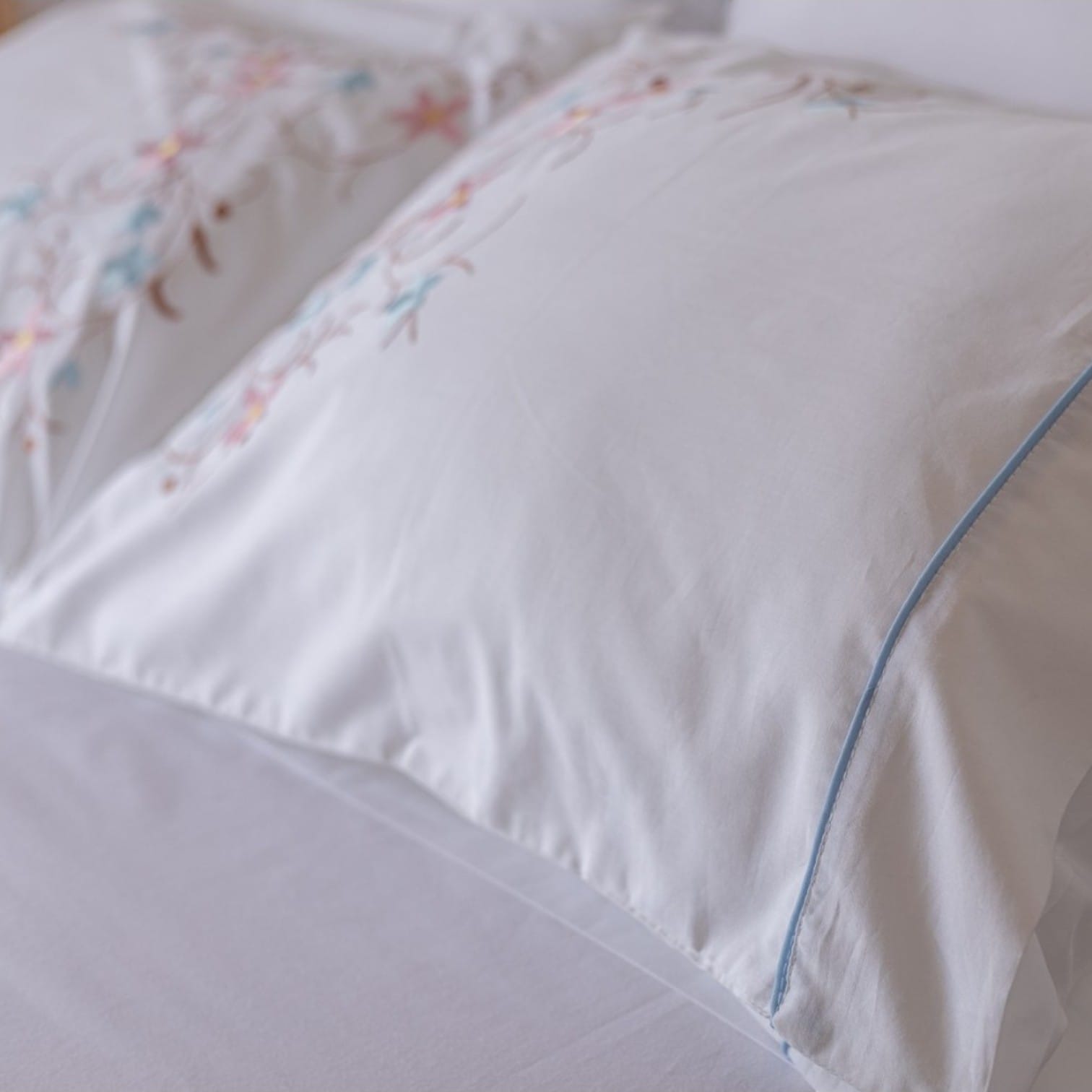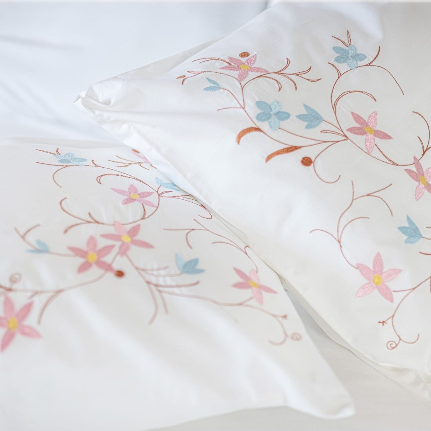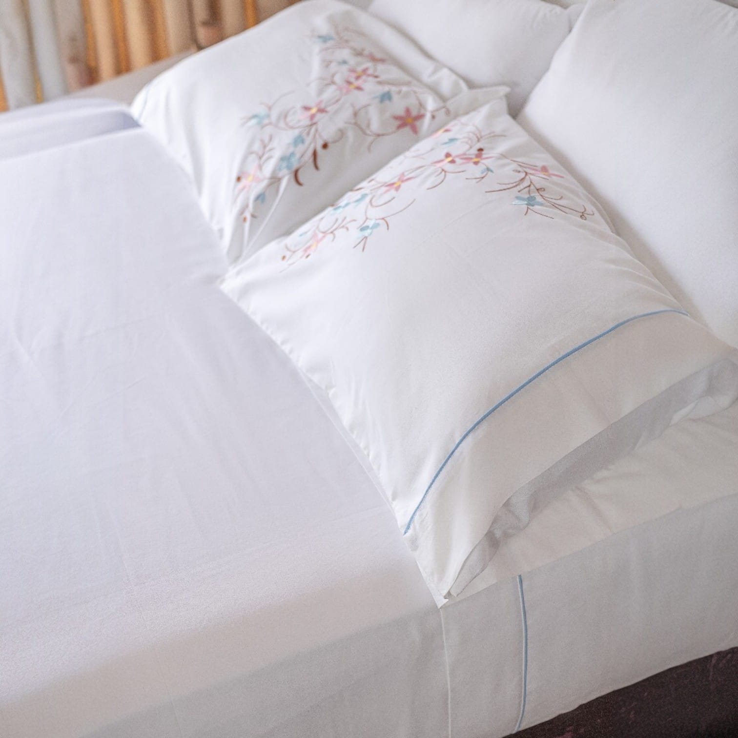 La elegancia está en los detalles, y nuestro set de cama blanco es la prueba de ello. Confeccionado íntegramente en algodón puro, destaca por un exquisito bordado de Árbol de Flores cuyas tonalidades pastel evocan la calma de la primavera. Cada funda y sobre sábana ha sido meticulosamente terminada con un embone azul celeste, creando un contraste sutil y sofisticado que eleva la decoración de cualquier dormitorio. Es el equilibrio perfecto entre la frescura del blanco y la calidez de un diseño artesanal.