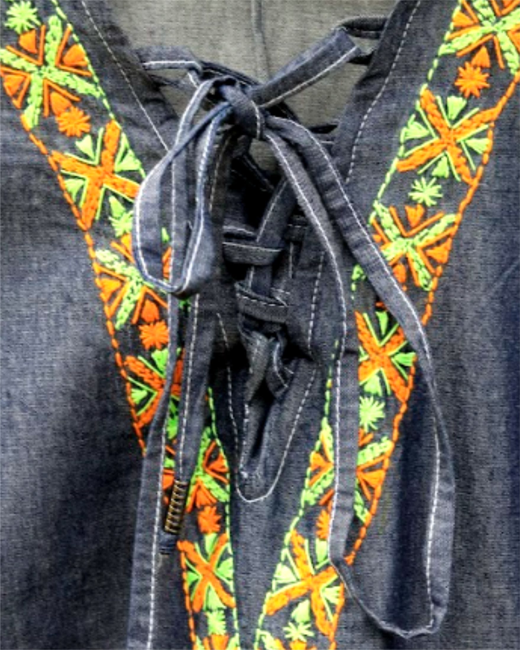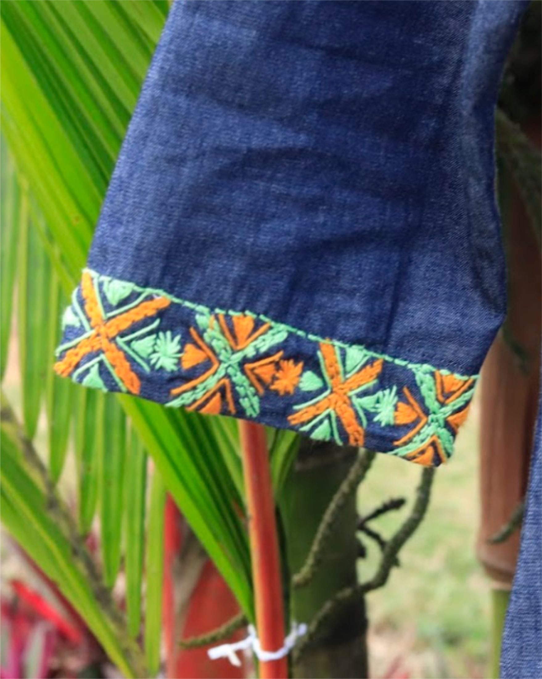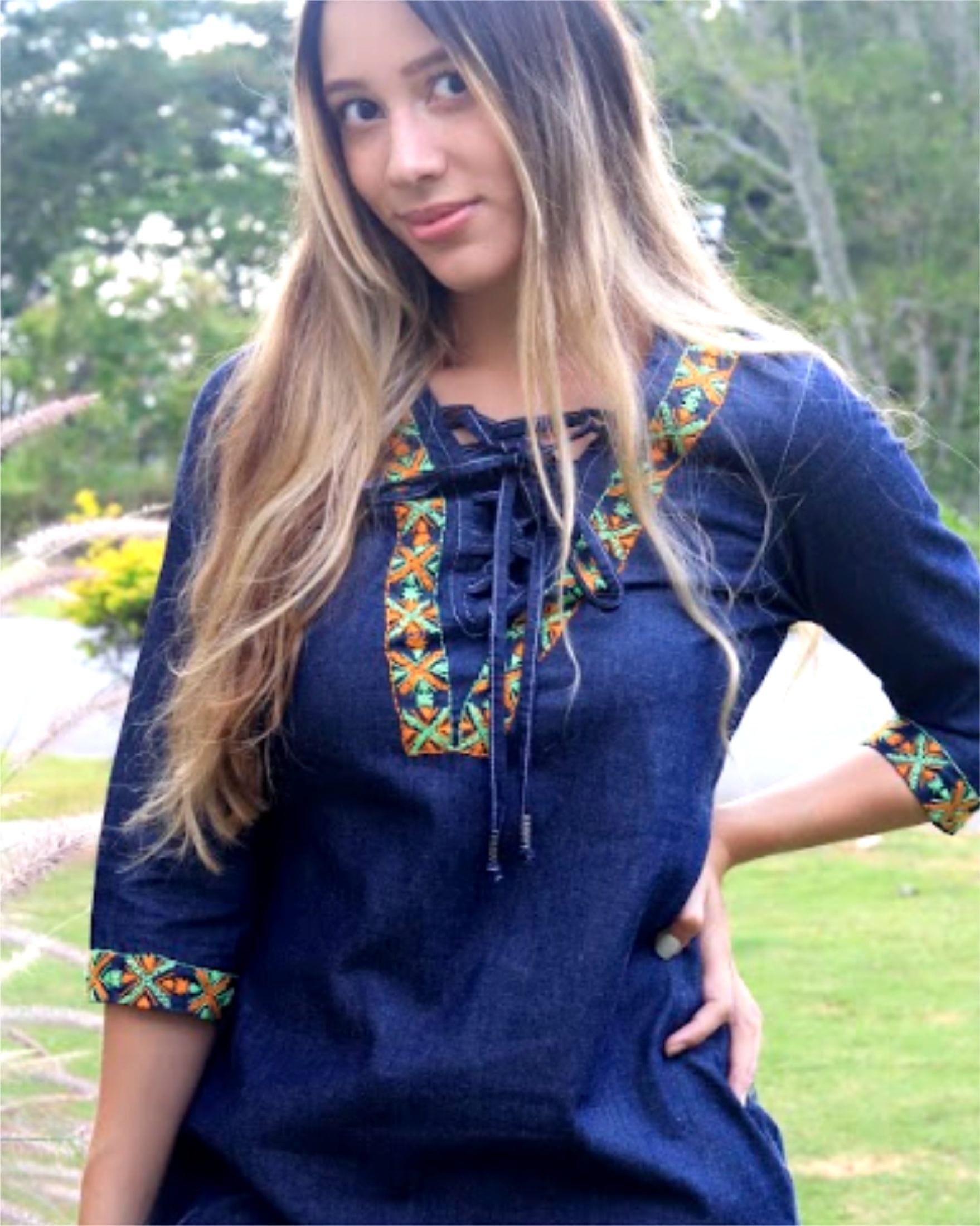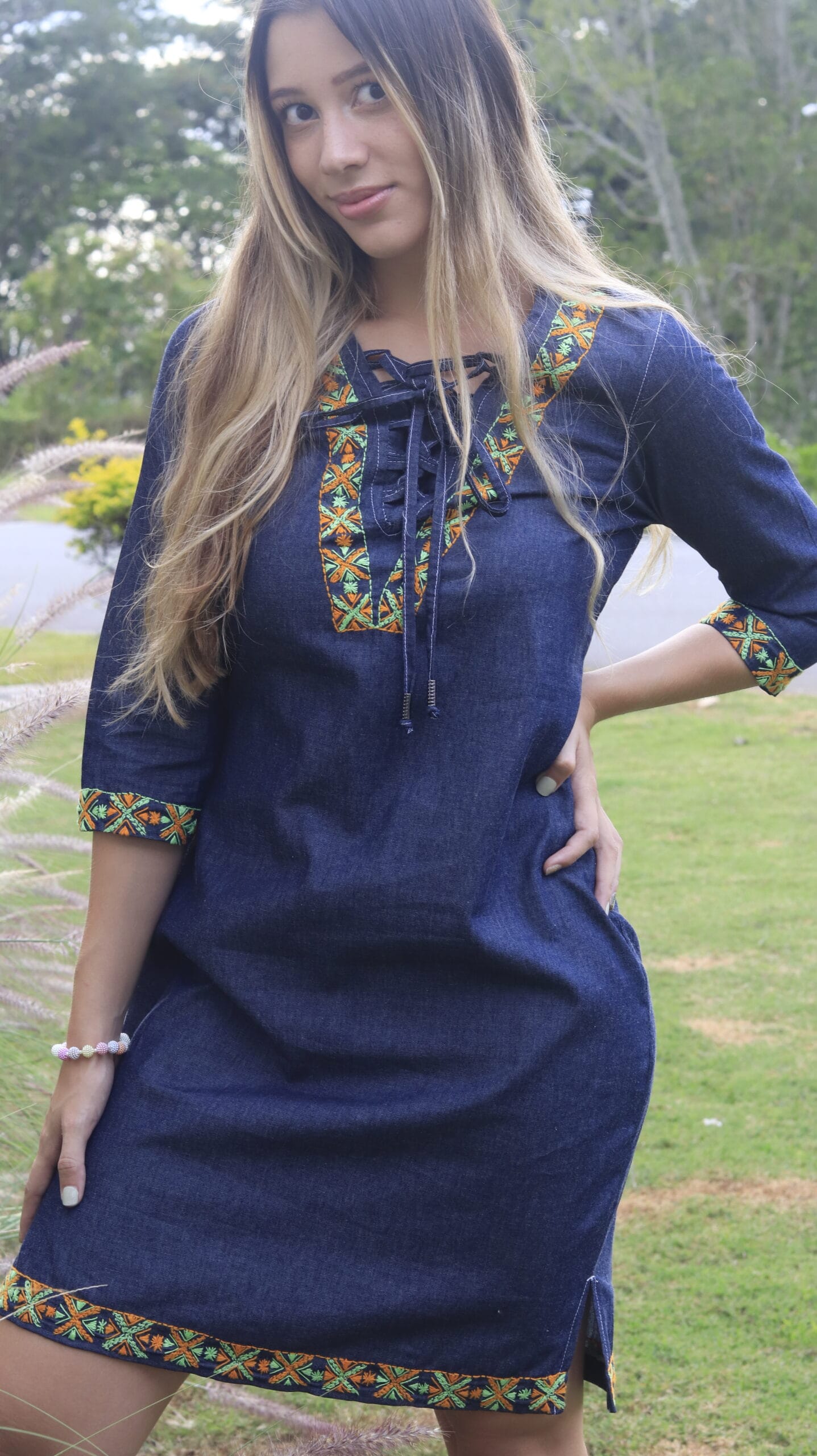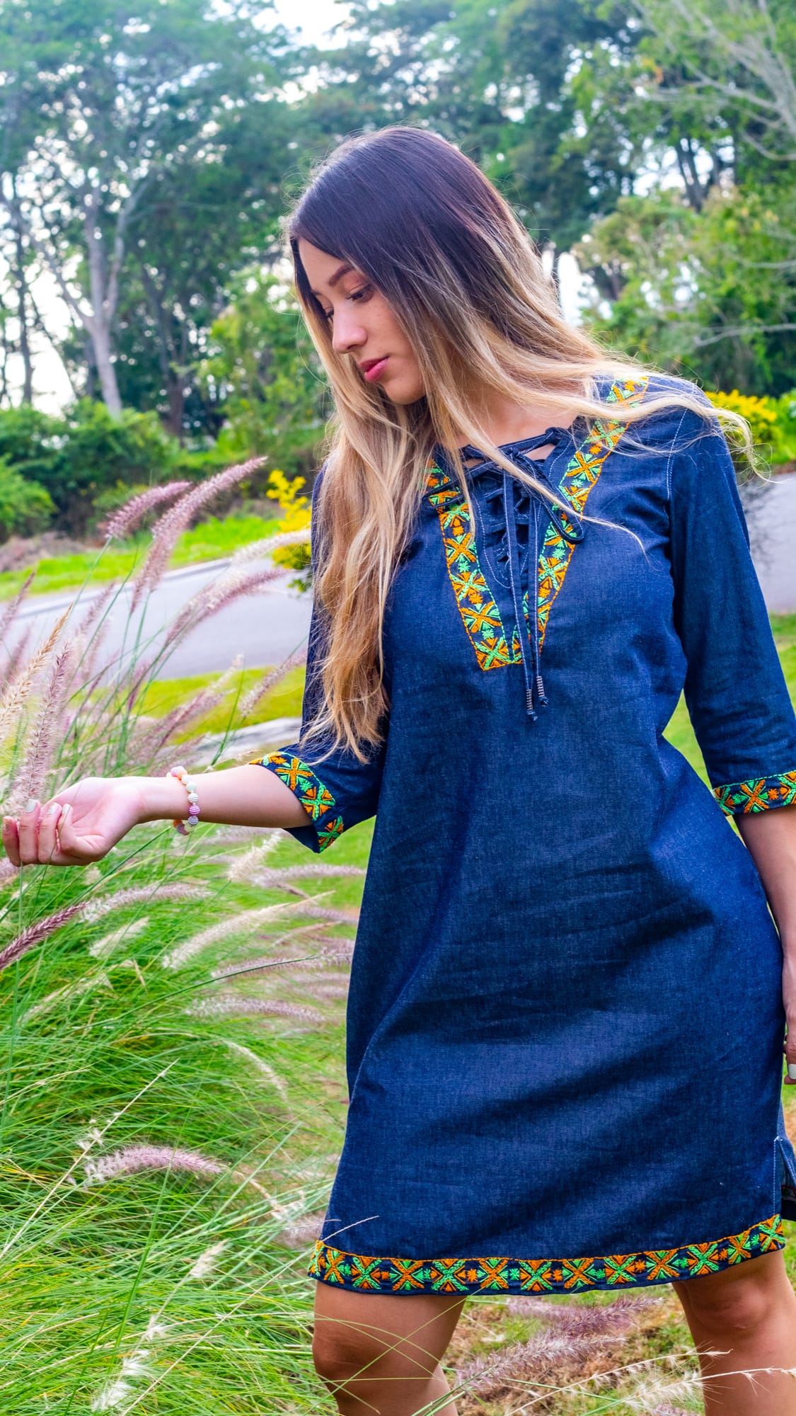 Vestido casual y cómodo, bordado a mano en cuello, puños y ruedo. Su diseño en tela lino 100% algodón, tipo Jean, hace que luzcas fresca y cómoda, con ese toque de elegancia al momento de lucirlo.
